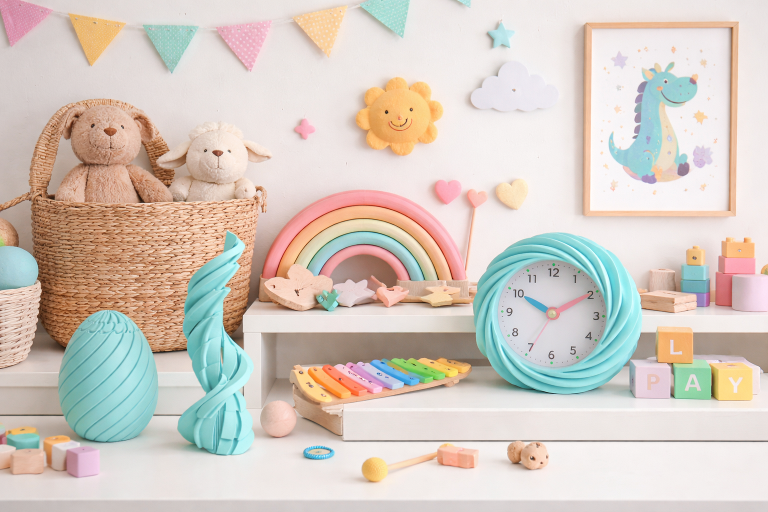 The soft pastel finish and flowing curves add a cheerful personality while maintaining a clean, minimal look. Perfect as a standalone display or styled together, this decor brings creativity and charm into children’s spaces without looking cluttered.